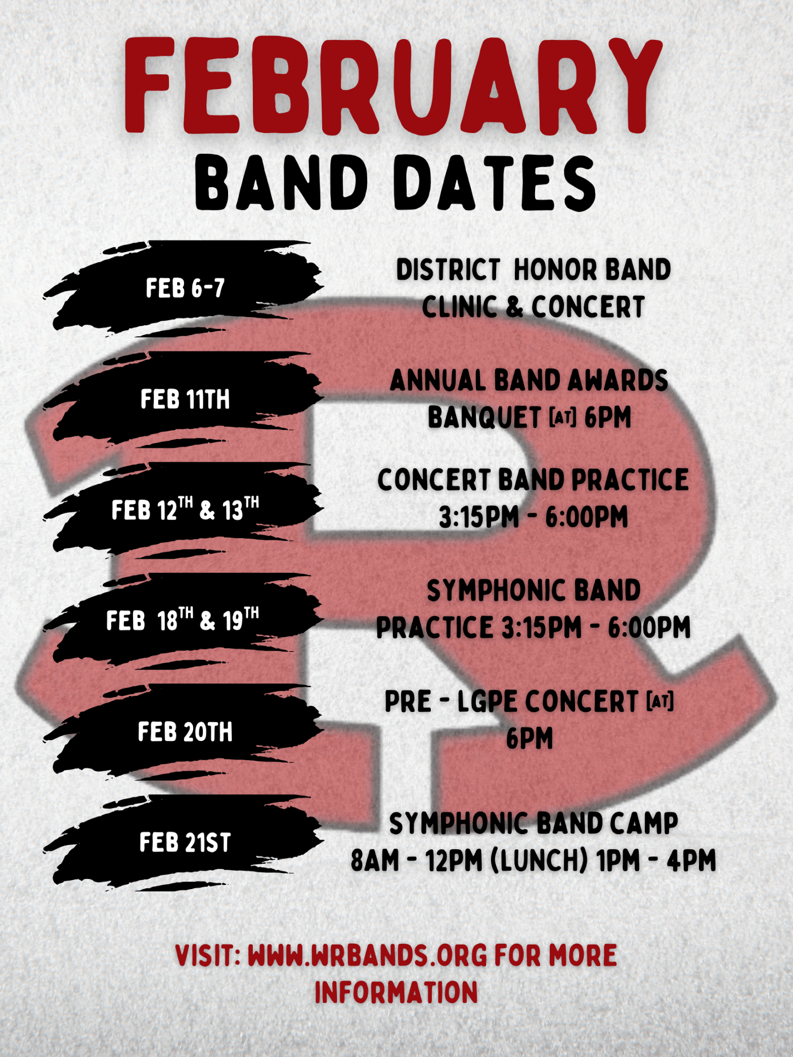 Please make sure you are paying close attention to all dates in February listed below. Every rehearsal and performance is mandatory for all students. Your attendance and commitment are essential to the success of our program, and being present ensures we are prepared, polished, and performing at our best. Thank you for your responsibility and dedication!