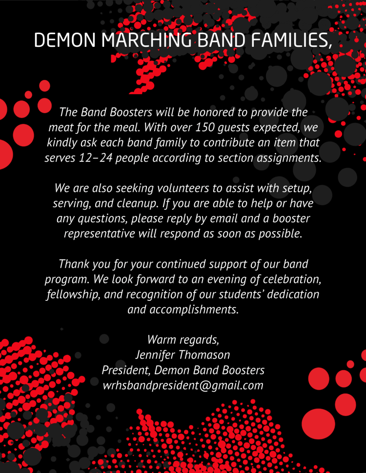 BAND AWARDS BANQUET Posted byThe EditorFebruary 3, 2026Posted inNews & Events Share this: Share on Facebook (Opens in new window) Facebook Share on X (Opens in new window) X Email a link to a friend (Opens in new window) Email Share on LinkedIn (Opens in new window) LinkedIn Share on Pinterest (Opens in new window) Pinterest Print (Opens in new window) Print Like Loading... Related Published by The Editor -Fine Arts Program Administrator -Band Director -Adjudicator -Arranger -Writer View more posts