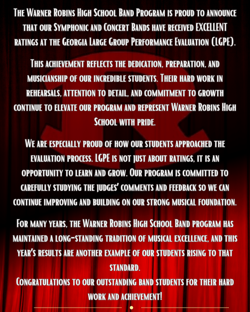 GO BAND!: Large Group Performance Evaluation Results Posted byThe EditorMarch 14, 2026Posted inNews & Events Share this: Share on Facebook (Opens in new window) Facebook Share on X (Opens in new window) X Email a link to a friend (Opens in new window) Email Share on LinkedIn (Opens in new window) LinkedIn Share on Pinterest (Opens in new window) Pinterest Print (Opens in new window) Print Like Loading... Related Published by The Editor -Fine Arts Program Administrator -Band Director -Adjudicator -Arranger -Writer View more posts