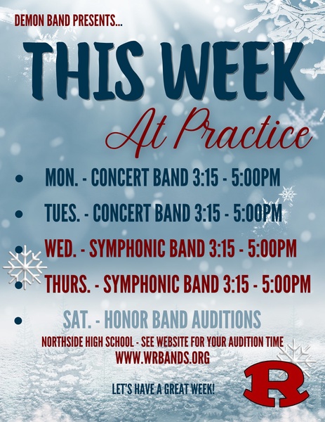 Please observe the practice schedule for all groups and Honor Band on Saturday!