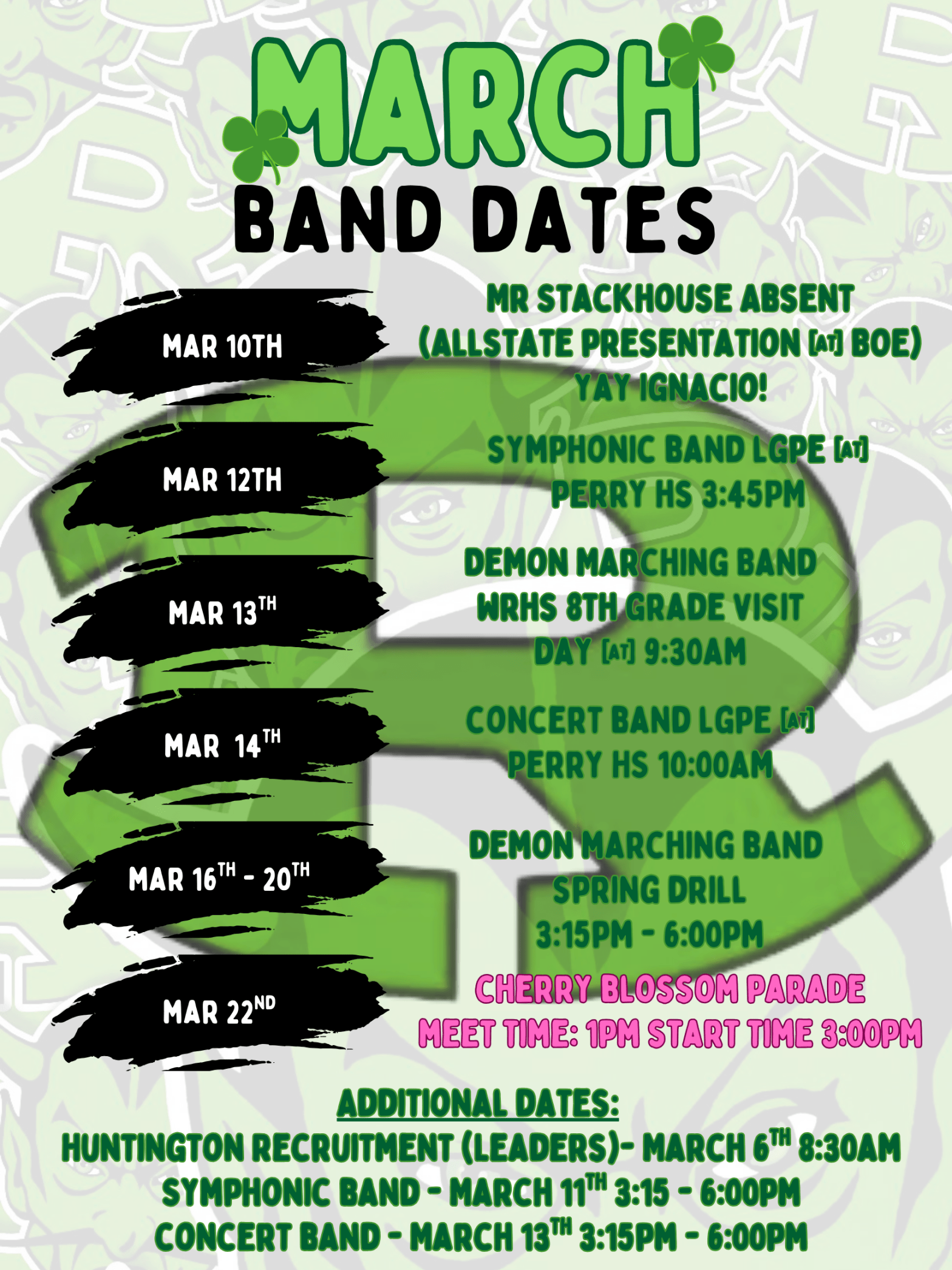 This is the most current seating arrangement for the WRHS Concert Band. This seating may change as we matriculate through the school year.