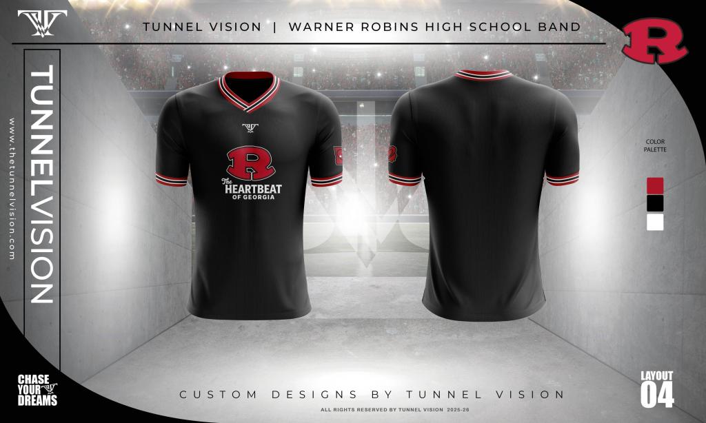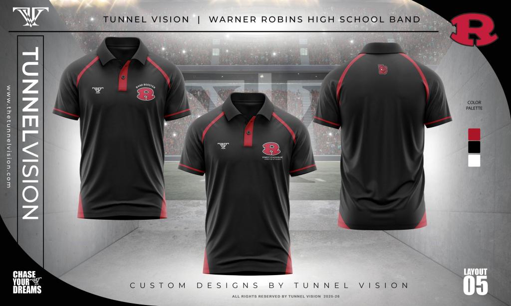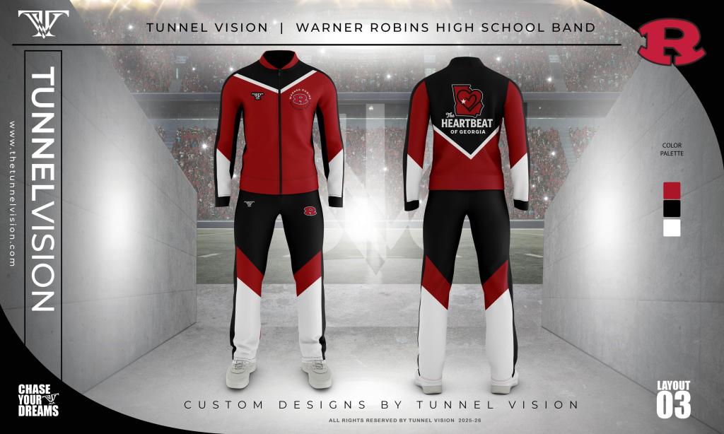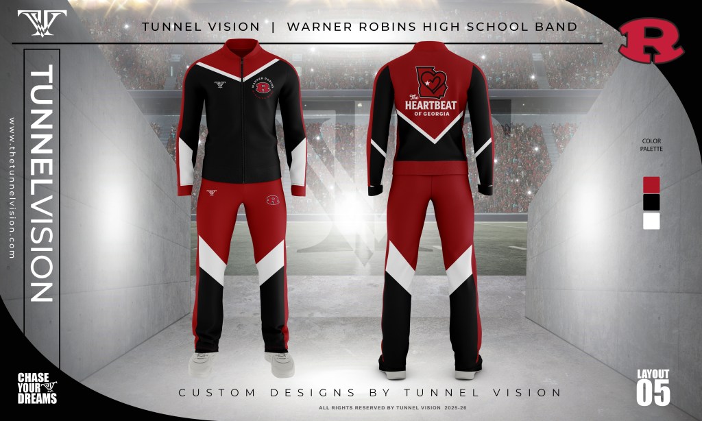 The tracksuits and t-shirts pictured above will serve as the official band uniform for football games and local events. Our formal uniform will still be worn, but for competitions and formal performances only.